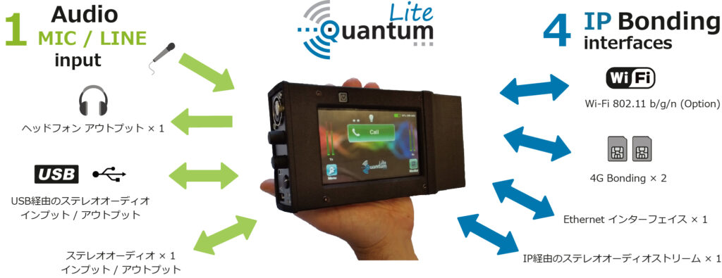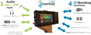 | 製品紹介 | Quantum Liteは、5G/4G/3G/Wi-Fiなどのモバイル網とインターネット網どちらのIP伝送にも対応した携帯型コーデックです。 2x 3G UMTS/4G LTE/5G、1xイーサネット、1x Wi-Fiを組み合わせて、最大4つのアップリンクIP接続が可能です。OpusとApt-xによる低遅延な音声伝送が可能で、自動ジッター・バッファ、IP Bonding、ネットワークのリアルタイム監視ツール、FECおよび動的パケット修復など多数の機能を搭載しています。 |