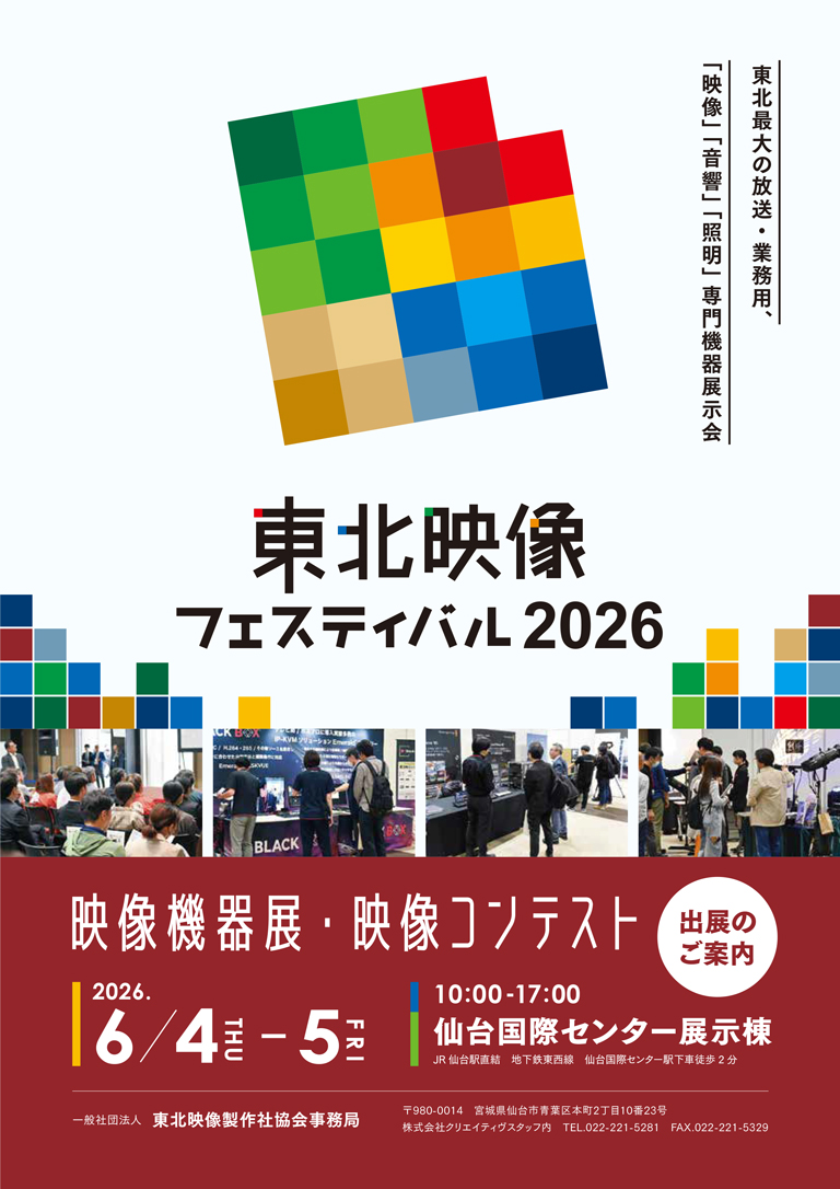 東北映像フェスティバル2026 映像機器展を開催いたします。 掲載日: 2025年12月8日 (2025年12月8日更新) 以下の日程で東北映像フェスティバル2025を開催いたします! 開催日:2026年6月4日(木)~5日(金) 会 場:仙台国際センター展示棟 ※来場者事前登録開始は、2026年4月頃を予定しております。